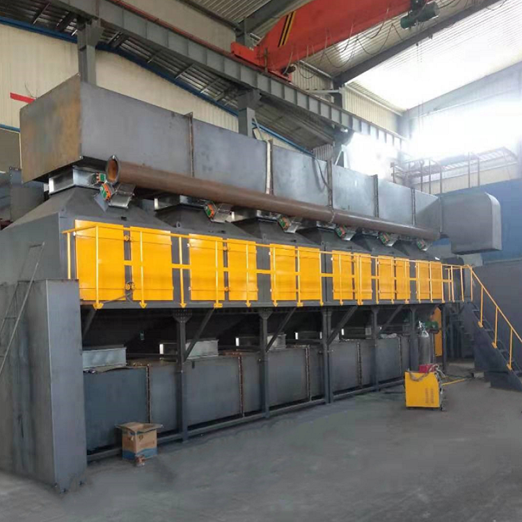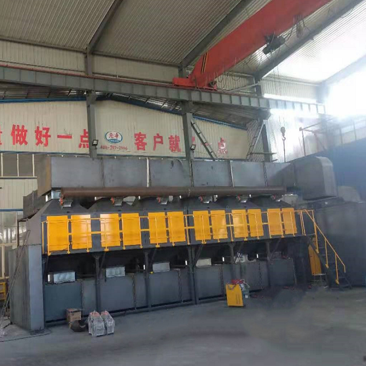 通過前面的預(yù)處理后,廢氣通入后端的活性炭吸附/脫附塔進(jìn)行吸附處理,通過活性炭微孔的有機(jī)氣體吸附在活性炭表面,去除廢氣中的有機(jī)物,抵達(dá)凈化氣體的作用。 催化燃燒裝置活性炭進(jìn)行脫附時(shí),打開防爆閥同時(shí)啟動(dòng)脫附風(fēng)機(jī)對催化劑進(jìn)行15分鐘的吹掃,然后防爆閥和脫附風(fēng)機(jī)關(guān)閉,3組加熱管開始分階段加熱,間隔2分鐘開啟一組,當(dāng)催化燃燒裝置溫度加熱到200攝氏度時(shí),脫附風(fēng)機(jī)打開,將熱空氣向吸附箱吹送,熱空氣輸送到混流箱,進(jìn)行空氣中和,但熱空氣在混流箱內(nèi)溫度達(dá)到特定溫度時(shí),空氣通過下端的輸送管輸送到活性炭的吸附室內(nèi),對活性炭進(jìn)行脫附,活性炭室內(nèi)溫度慢慢升高,活性炭內(nèi)有機(jī)廢氣分解出來,通過上面的管道回到催化裝置內(nèi)。與催化劑反應(yīng)生成CO2和H2O,同時(shí)產(chǎn)生大量的熱量。這時(shí)候加熱管會(huì)根據(jù)室內(nèi)溫度自動(dòng)調(diào)節(jié)關(guān)閉一組或幾組加熱管,節(jié)約能源,催化劑表面都有陶瓷蓄熱體,能有效的鎖住熱量,降低能耗。